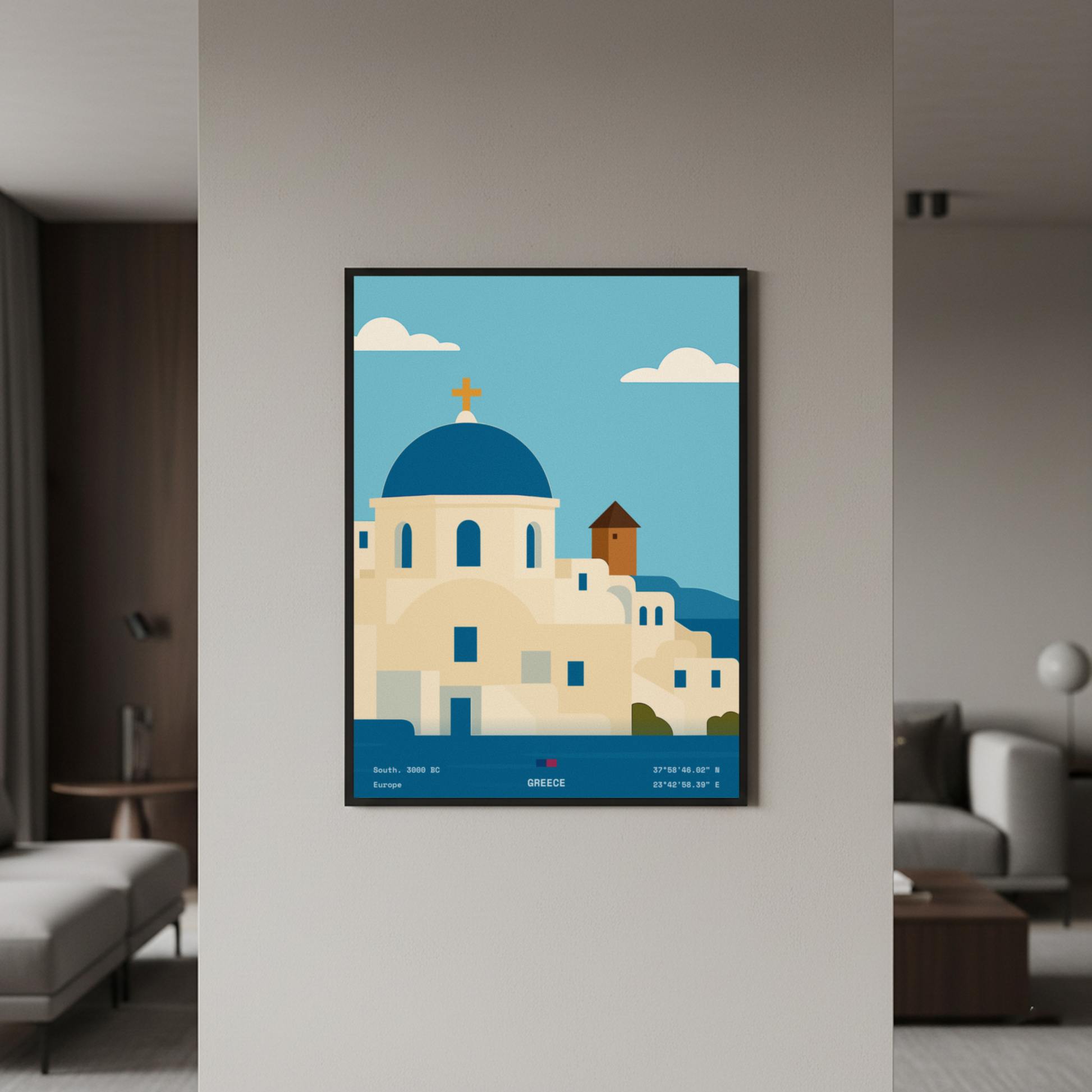 Timeless blue skies, whitewashed architecture, and Mediterranean charm — this minimalist artwork captures the essence of Greece in a clean, modern style. Inspired by the beauty of the islands and ancient history, it’s the perfect piece to bring brightness, culture, and elegance to your home.