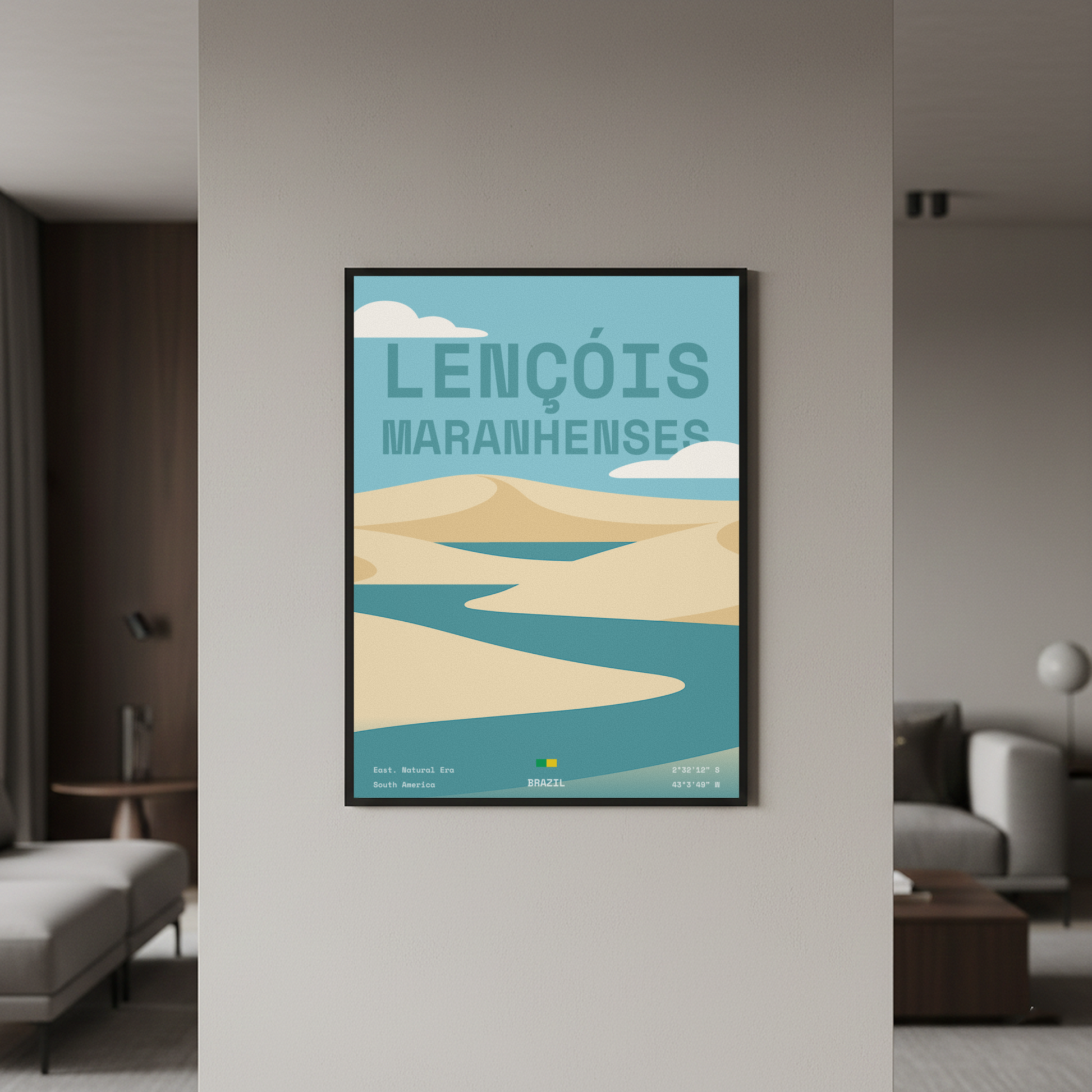 Bring the surreal beauty of Brazil’s Lençóis Maranhenses into your home with this minimalist artwork. Inspired by the sweeping sand dunes and crystal-clear lagoons, this piece blends natural wonder with modern design. A perfect addition for those who love unique landscapes and serene, statement-making decor.