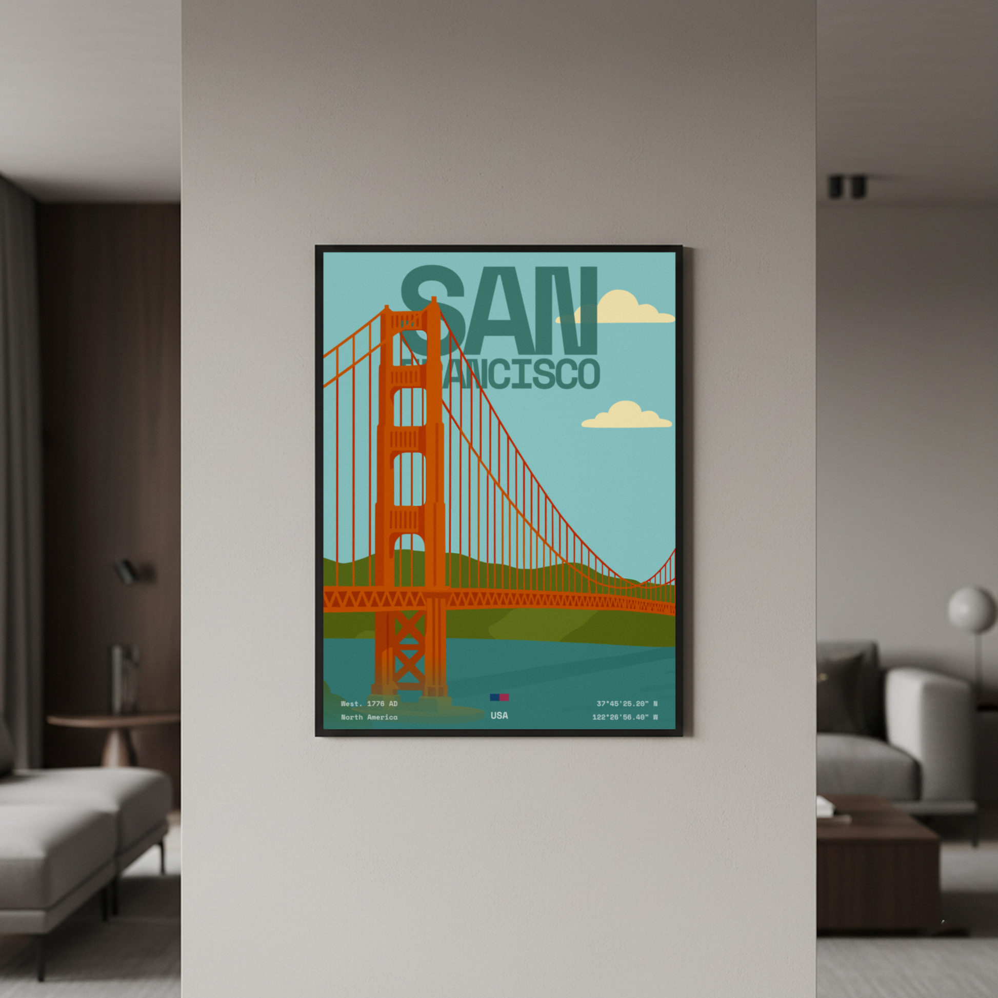 Capture the charm and character of San Francisco with this minimalist artwork. Featuring clean lines and subtle nods to landmarks like the Golden Gate Bridge, this piece brings a sense of west coast cool and urban elegance to your space. Perfect for lovers of architecture, travel, and modern design.